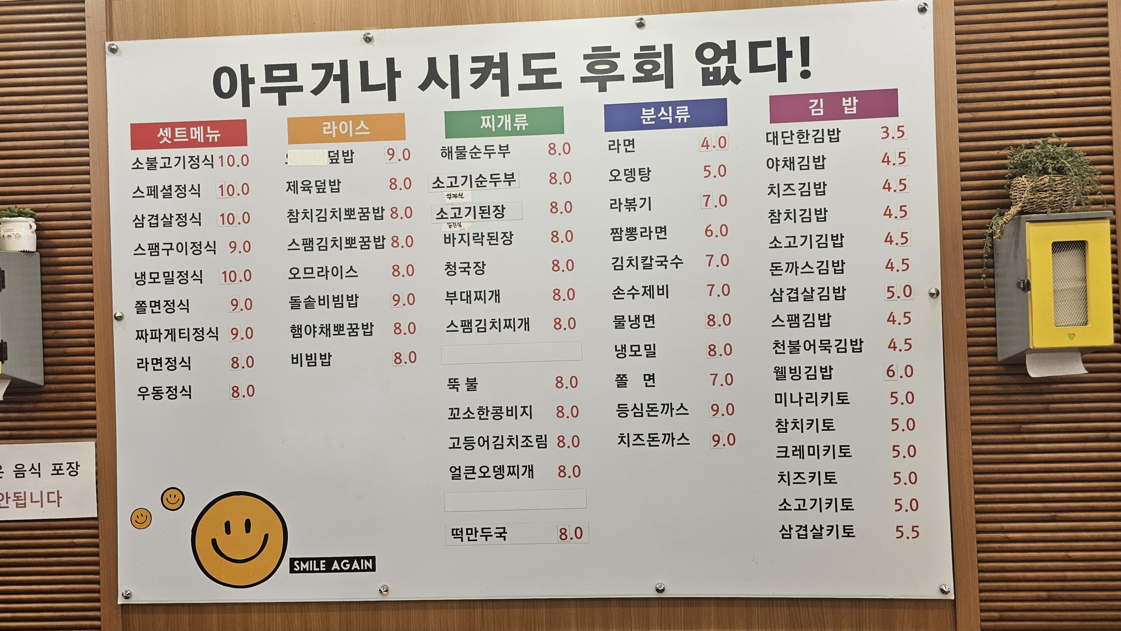 김밥천국보다는 메뉴가 적은 것 같긴한데 뭘 먹을지 고민하게 만드는 메뉴판이네요. 😊